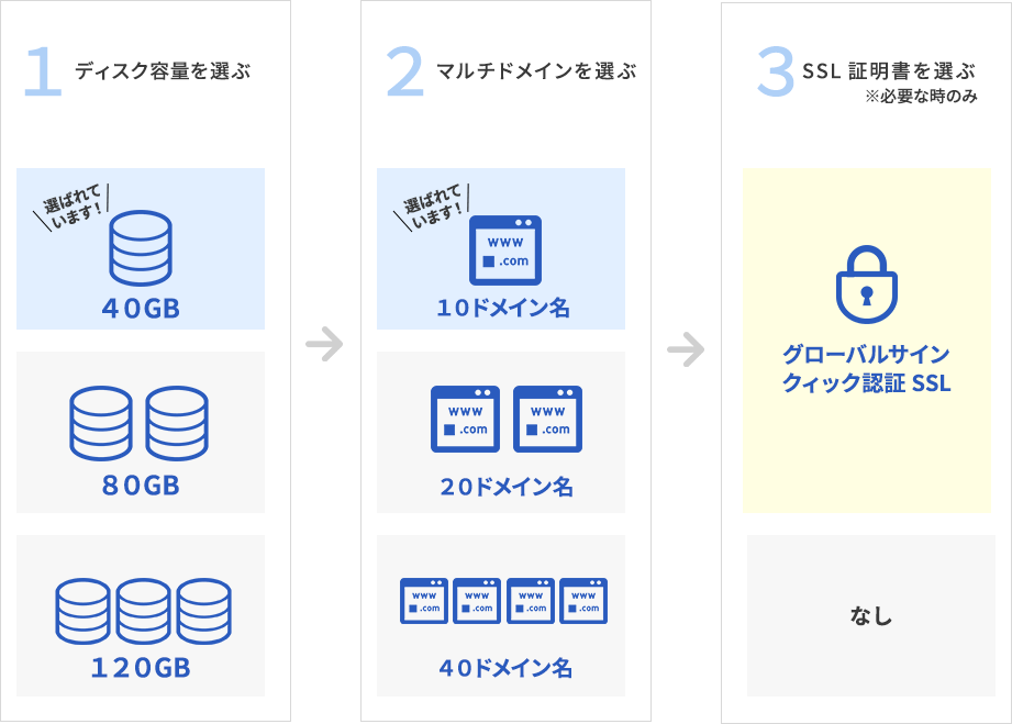 1. ディスク容量 2. マルチドメイン (レンタルサーバーでの複数ドメイン名のご利用) 3. SSL 証明書 のそれぞれの選択肢を、お客様のご利用の用途に合わせてお選びいただけます。